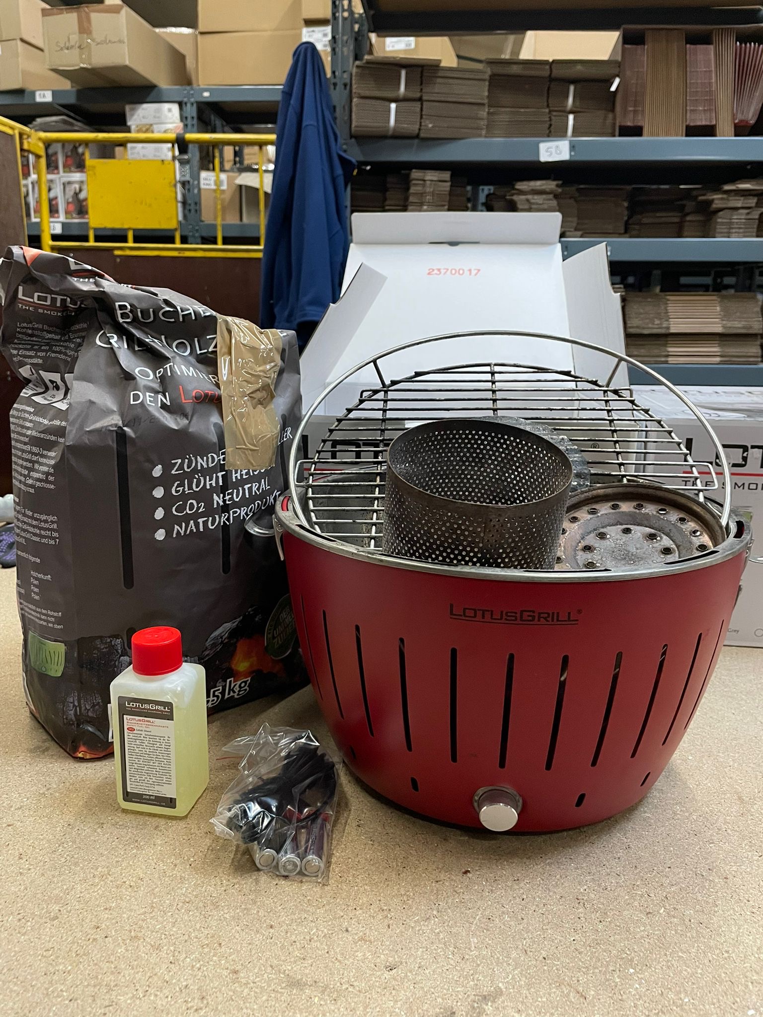 LotusGrill Classic Feuerrot - B-Ware gebraucht mit Lackkratzer und Delle ohne Tasche, 200ml Brennpaste und 2,5kg Kohle - NR 65